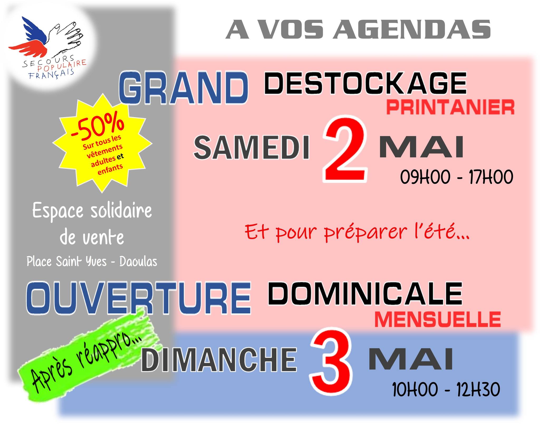 BRADERIE de déstockage printemps/été le samedi 2 mai 2026 de 9h à 17h- 50 % sur tous les vêtements adultes et enfants. Beaucoup d’articles de saison de seconde main en très bon état. Toujours des livres, des jouets, du linge de maison, de la déco , des articles neufs….