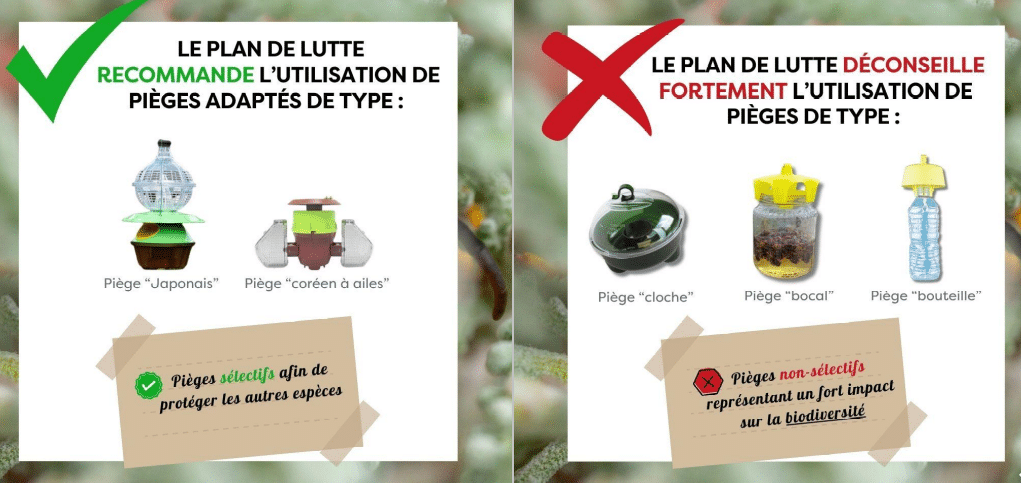 Des pièges totalement inadaptés et fortement déconseillés existent sur le marché. Ces pièges non sélectifs présentent un danger sérieux pour les insectes locaux (abeilles, frelons européens…). Ils sont peu onéreux mais ils ont un effet délétère sur la biodiversité en capturant tous types d’insectes, sans distinction aucune, qui sont pourtant utiles à notre environnement.