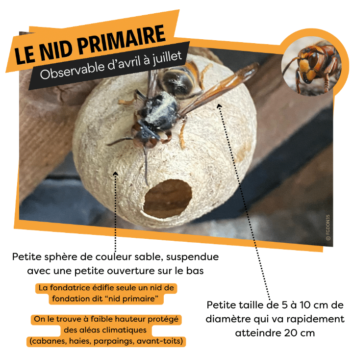 Les frelons asiatiques s’installent principalement dans les zones habitées, sources de nourritures et reviennent d’année en année dans les mêmes secteurs. Dès mars, les reines construisent un nid primaire où elles pondent pour constituer leur colonie. Ces nids primaires, de quelques centimètres de diamètre, sont installés dans des abris ventilés (carports, toitures, abris de jardins, etc). A terme, ils peuvent atteindre 2m de circonférence avec plus de 3 000 frelons.